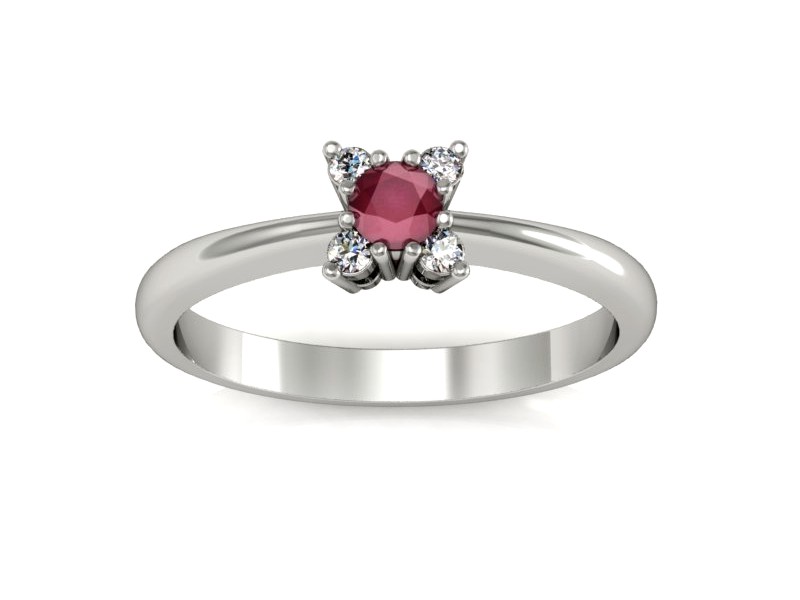 Każdy element pierścionka został dopracowany w najdrobniejszym szczególe. Smukła szyna o delikatnym profilu harmonijnie łączy się z oprawą kamieni, zapewniając elegancję i wygodę noszenia. Rubin umieszczony w centrum kompozycji przyciąga uwagę, a cztery drobne diamenty dodają mu lekkości i szlachetnego charakteru.