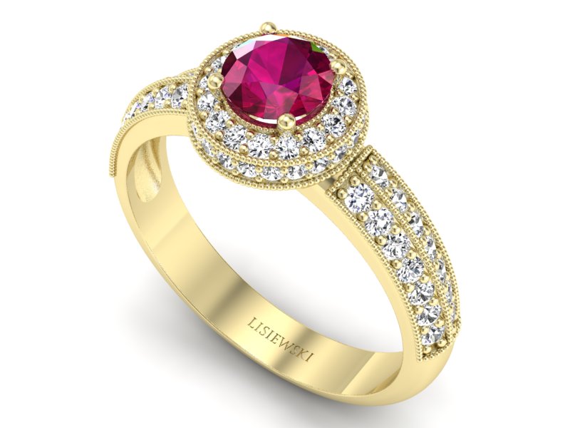 Kup śliczny pierścionek p16418zr z żółtego złota z pięknym rubinem i brylantami.