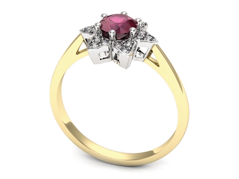 Pierścionek rubin diamenty żółto białe złoto - opis.