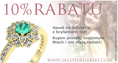 Przygotowaliśmy dla Państwa wyjątkowy prezent. Każda osoba, która dokona zakupu w naszym sklepie internetowym otrzyma upominek - kupon rabatowy, upoważniający do rabatu w wysokości 10% na każdy wyrób jubilerski dostępny na www.sklepjubilerski.com